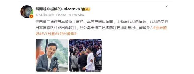 近期岛田慎二成为日本篮协主席,随后就开始了他的美国之旅,在美国他先行拜访了NBA湖人队的首发主力球员八村垒,双方关系有望缓解,并促进八村垒重回日本男篮;另外他还计划去拜访被公牛队裁掉的河村勇辉等球员。这两名球员如果回到日本队,将大大提升日本男篮的实力,中国队想要击败他们会非常的困难。
