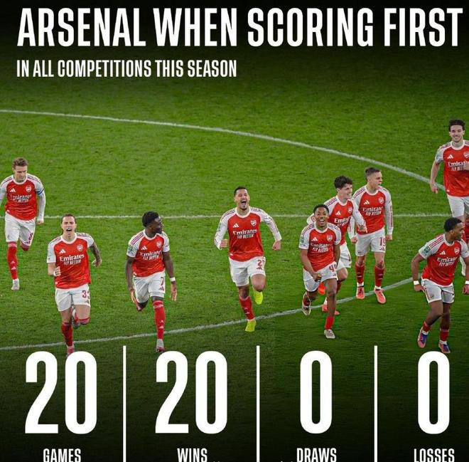 那就是根据技术统计,本赛季阿森纳在各项赛事中,只要率先取得进球,那么枪手就必将赢下比赛。本赛季到目前为止,阿森纳在各项赛事20场比赛中,成为率先进球的一方,结果这20场比赛,枪手全部取得胜利,球队取得100%胜率。